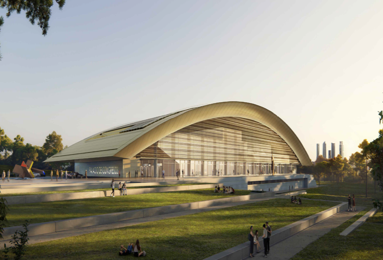 Su propuesta se plasma en un gran Palacio de Congresos con una superficie de 17.980 m2, bajo una gran cubierta dorada que será referente de sostenibilidad y ahorro energético y que albergará un gran auditorio con un aforo para cerca de 2.000 espectadores. Un auditorio de vanguardia que contará con la posibilidad de auditorios enfrentados para poder desarrollar todo tipo de eventos.